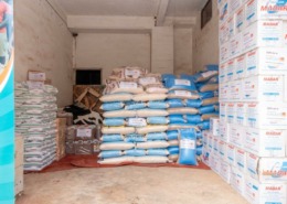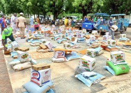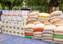 Chaque kit contient : 1 sac de riz (25 kg), 1 sac de mil (25 kg), 1 bidon d’huile (5 L), 5 kg de sucre, 15 bouteilles d’eau Kirène (10 L), 1 carton d’eau de javel, 1 carton de savon et 1 natte.